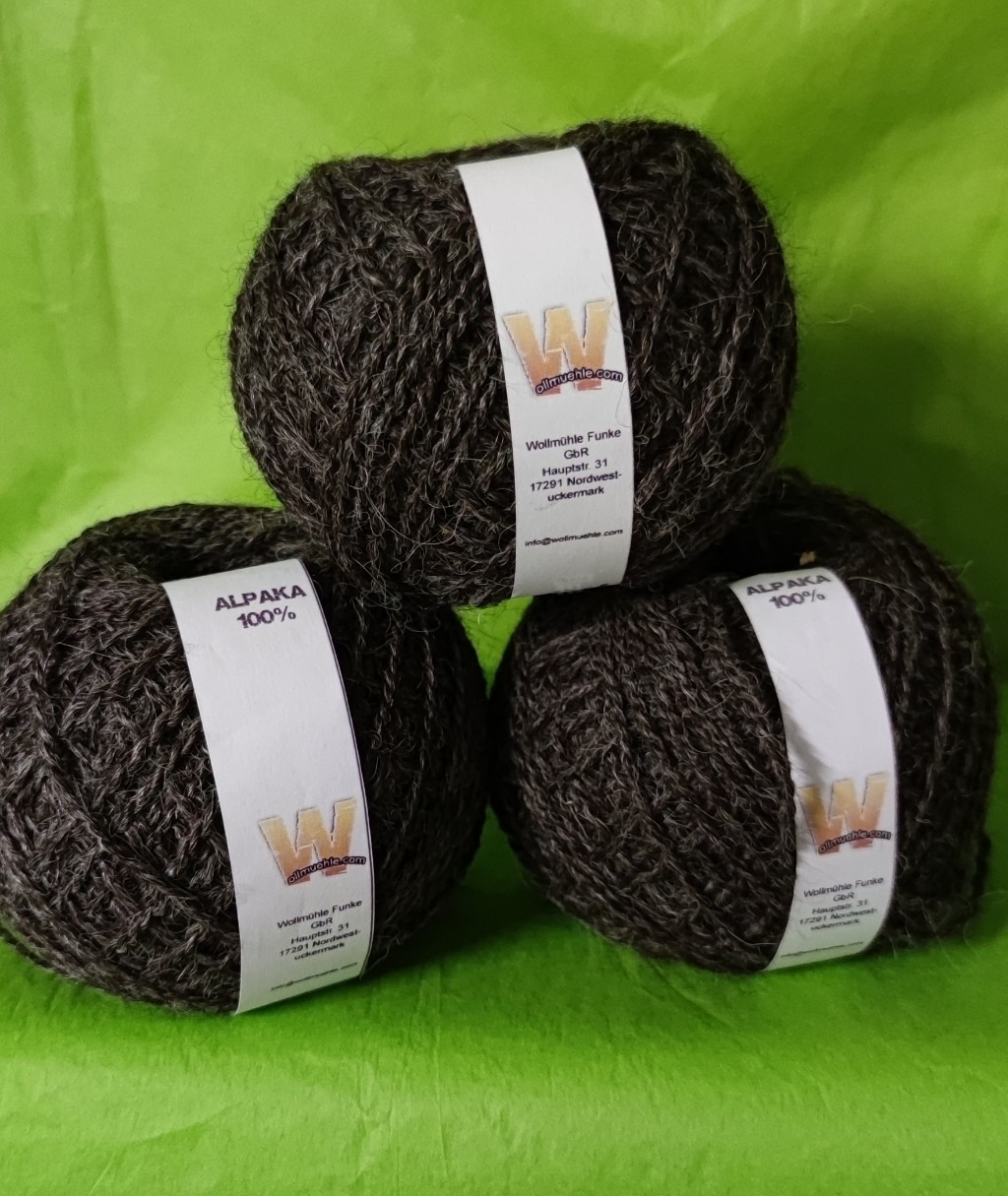 100 % Alpakawolle, 100 g je Knaul, Lauflänge 135 m, 2-fädig versponnen Nadelstärke 4-5
